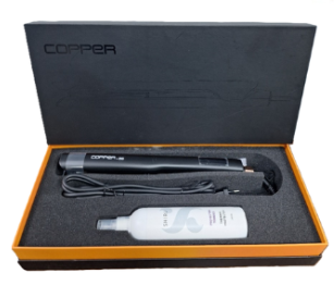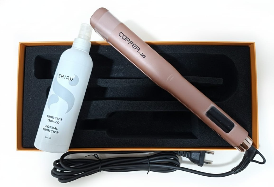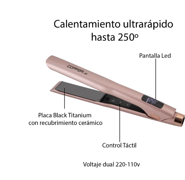 Plancha Copper con resistencia cerámica MCH, calentamiento ultra rápido, constante y estable. Cable profesional giratorio, temperatura regulable hasta 250 ºC, placa black titanium de 1.25 pulgadas con recubrimiento cerámico, control táctil y pantalla LCD. Función Auto Off y voltaje dual 110-220 V. Temperatura ajustable, máximo 250ºC